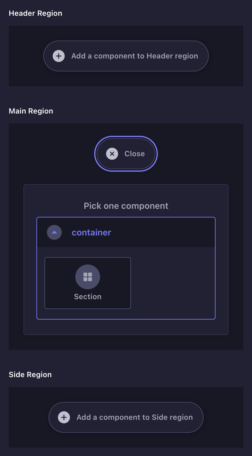 When you click on the "Add a component to Header/Main/Side region" (pill-shaped) button inside of a region field, you are presented with just one option—a section block.